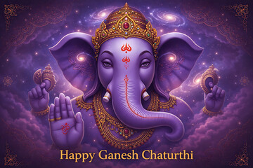 Mystical purple cosmic illustration of lord ganesha with four arms holding shells for ganesha chaturthi and sankashti chaturthi divine spiritual wallpaper background design