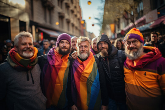 Mature lesbian and gay men and women holding lgbt flag at demonstration