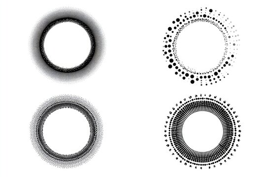 Four abstract, circular graphic elements.  Each circle frame has a different design, with varying textures and patterns of dots and lines.  The frames are in grayscale, creating a sense of depth