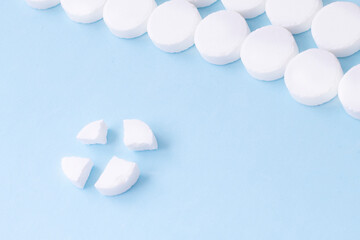 Round white medical pills arranged and one of them is crushed into four parts on blue background. Pill splitting.