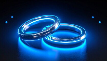 Two metallic rings radiating blue light on a dark surface, with four glowing dots in the background