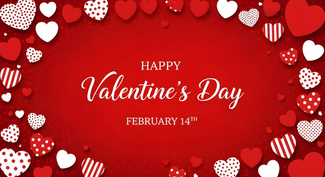 Festive red background with heart shapes and happy valentines day text february fourteenth
