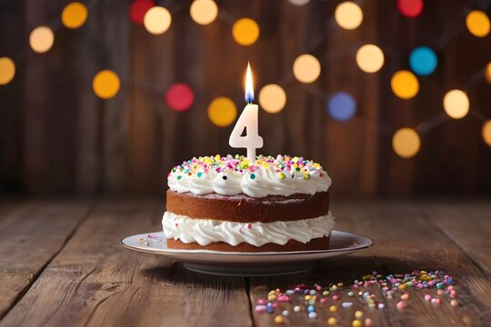 4th birthday cake with whipped cream, sprinkles, candle, and number 4 on wooden background with colorful lights