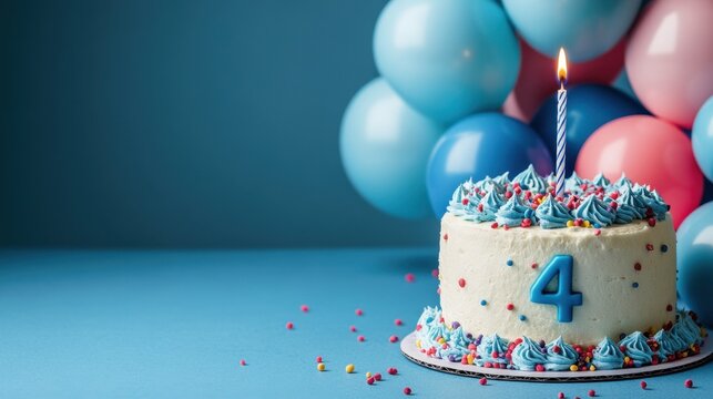 Celebration of a joyful fourth birthday with a beautifully decorated cake and colorful balloons in a festive setting