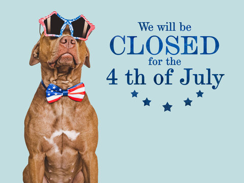Signboard with the inscription We will be closed for the 4th of July. Cute brown puppy. Closeup, indoors. Studio shot. Congratulations for family, loved ones, friends and colleagues. Pets care concept