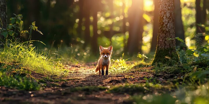Red fox, vulpes vulpes, small young cub in forest on a tree trunk. Cute little wild predators in natural environment