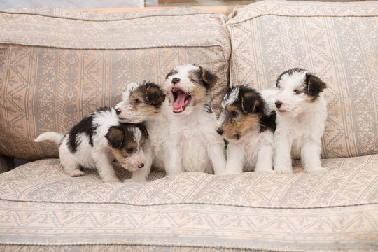 Proud nursing Smooth fox terrier dog, showing of her puppies. Looking straight to camera. Mouth open showing tongue. Isolated cutout on a transparent background.