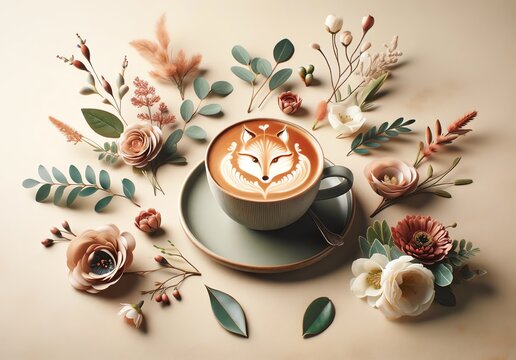 An image of a Fox Latte art coffee cup with flowers and leaves