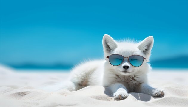 Happy cute white artic fox with sunglasses lying resting relaxing on beach sand on blurred sunny turquoise blue marine nature background with copy space. Funny wild animals summer holiday wallpaper.