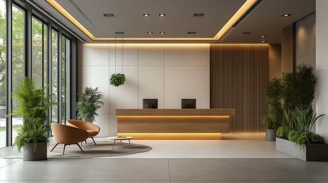 Modern office lobby with minimal design, embodying simplicity and professionalism in a clean, natural light setting.