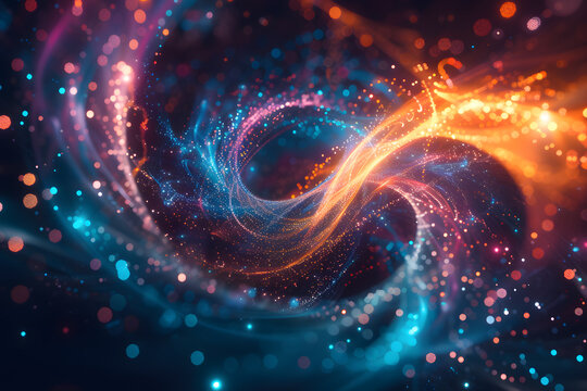 Swirling iridescent spiral vortex with granular bokeh and chromatic nebula gradient