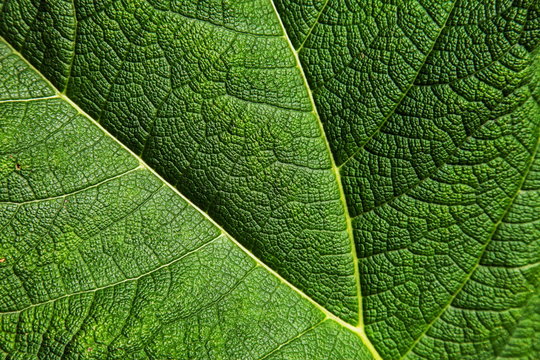 A close up of a bright green leaf showing the vein network