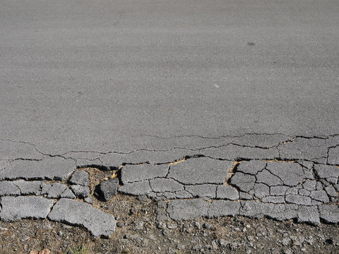 Severely cracked urban road, crumbling asphalt and widespread potholes marring the street leading into a city Extensive surface damage,  warning,  infrastructure