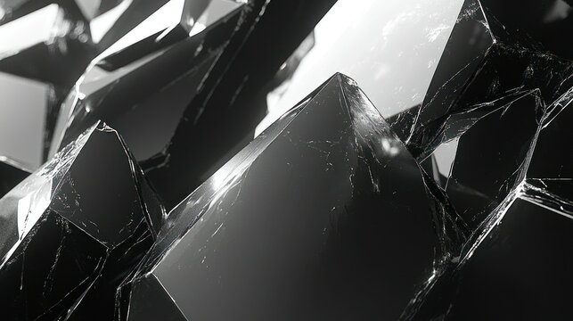 Abstract close-up view of shattered, multifaceted, dark gray crystalline structures, with fractured edges and reflective surfaces