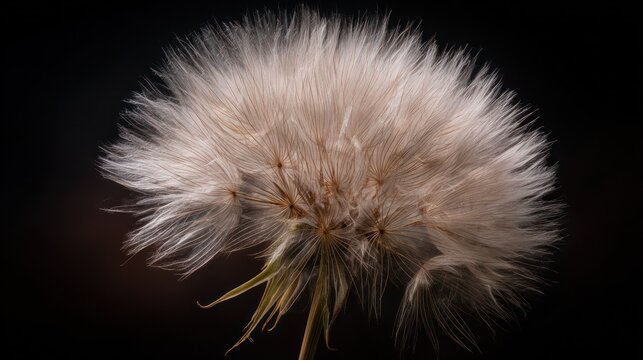 Close-up of dandelion seeds with delicate white filaments and brown stems isolated against a soft dark background in high detail