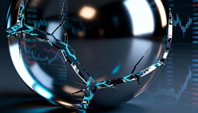 Cracked reflective glass orb shattering on surface with scattered shards and coins