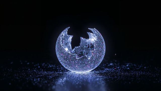 Glowing broken glass orb with sparkling glitter, blue neon glow and reflective surface