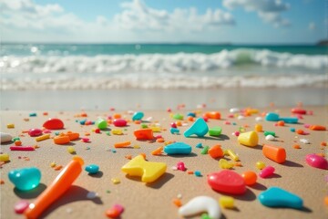 Colorful plastic fragments scattered on a sandy shore