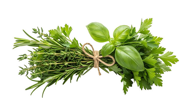A fragrant bundle of fresh herbs tied with twine, perfect for culinary creations. The arrangement showcases a variety of herbs, creating a feast for the eyes and the senses