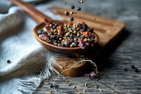 Spice fragrant mix of fresh spices and dried berries on wooden spoon on linen on wooden stand at table