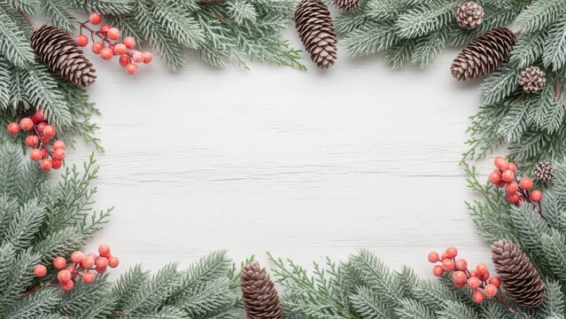 Framing evergreen wreath border with red berries and soft bokeh holiday glow