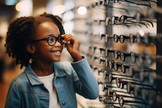 A dark skinned 10-year-old girl trying-on glasses
