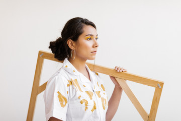 young woman with painted shirt holding painter's canvas frame