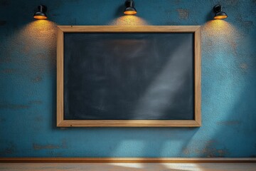 Empty wooden framed chalkboard illuminated by three warm lights on textured blue wall with rustic peeling paint and wooden baseboard