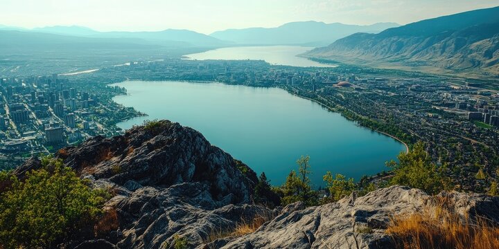 Sunlit panoramic view from a mountain peak overlooking a large lake framed by a vibrant cityscape with green hills in the background