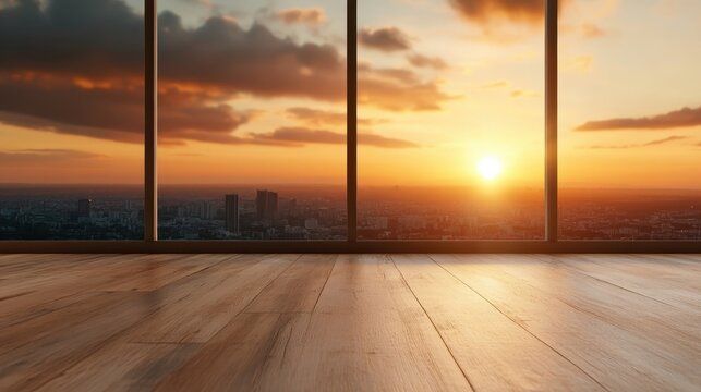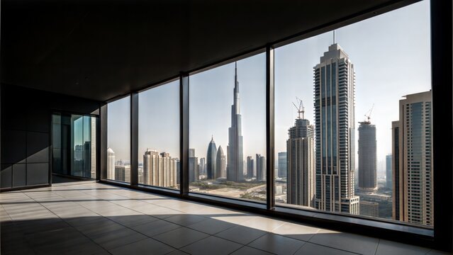 Modern bedroom with a framed artwork overlooking cityscape through windows