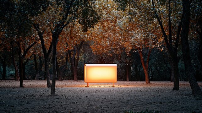 A park at dusk with warm orange hues, a product illuminated softly, trees framing the scene, and text space on the top right.