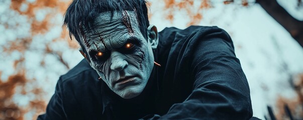 Frankenstein monster with moody background and dark expression