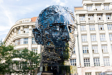 A kinetic sculpture of Franz Kafka’s head in Prague, made of rotating reflective layers that form and dissolve the face in a hypnotic motion