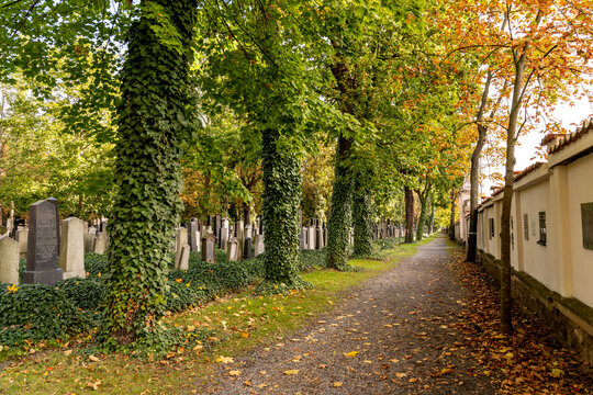 The New Jewish Cemetery in Zizkov district, Prague, Czechia, where notable people such as Kafka are buried.