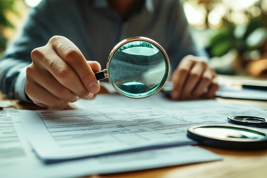 Business Auditor Examines Paperwork with Magnifying Glass for Fraud During Corporate Tax Audit