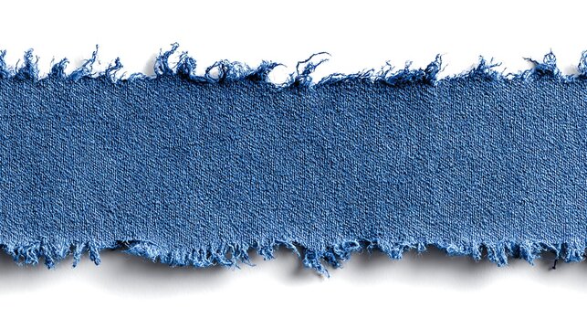 Frayed edge of torn denim fabric on a white background with copy space for text placement