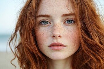 Confident young redhead woman with vivid freckles and a subtle smile
