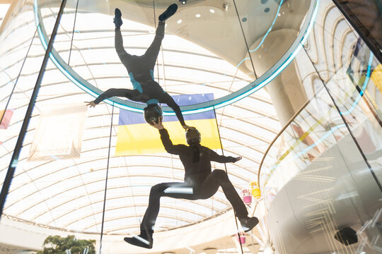 Skydivers in indoor wind tunnel, free fall simulator