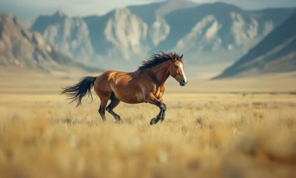 Magnificent white good footed horse is running in the desert in a hot daytime, Generative AI.