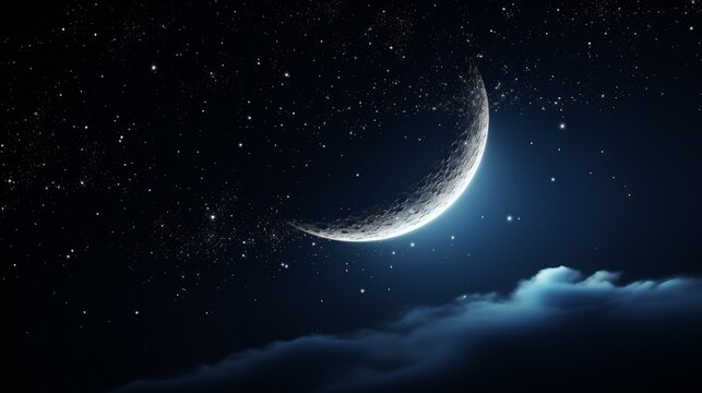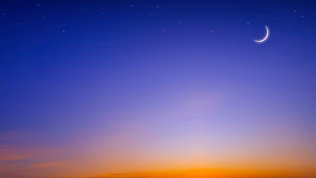 Crescent moon and stars on colorful twilight sky, Beautiful evening sky for Ramadan holy month background decoration during iftar period with free space for edit text