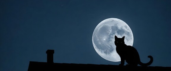 Black cat sitting on a roof looking at the moon on Halloween night