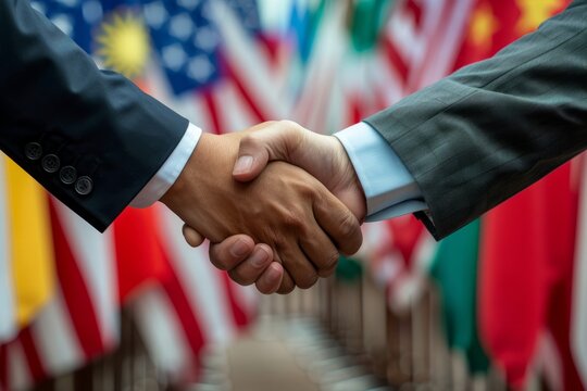 Two people pointing at digital tablet showing world map with glowing connection lines representing global free trade agreement talk and network communication