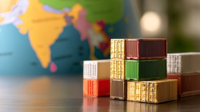 Shipping containers as graph chart growth and FTA letters with white wall background. Concept of free trade agreement (FTA), global international trade, world economic, investment, cargo shipping.