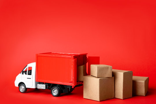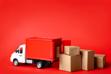 Toy truck with boxes on red background Logistics and wholesale concept