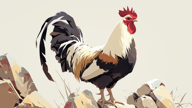 A rooster with black and white feathers, a red face on the head of its comb, perched on top of rocks, in the style of Chinese ink painting with freehand brushwork lines,