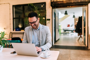 Young male freelancer sitting front of a laptop computer in cafe.