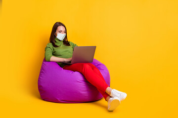 Full size photo of lady freelancer sit comfort violet bean bag working notebook wear mask isolated yellow color background