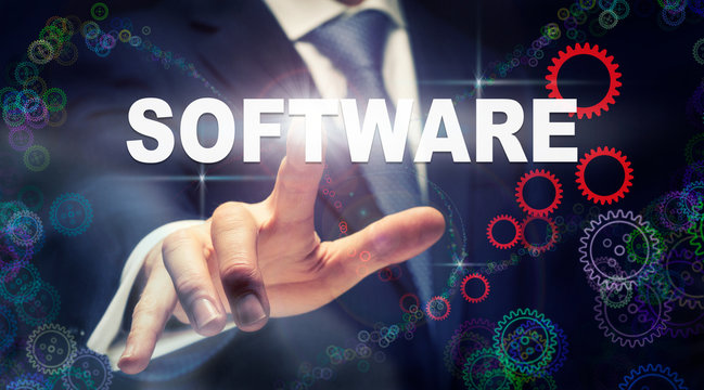 A businessman pressing a Software business concept on a graphical display of cogs
