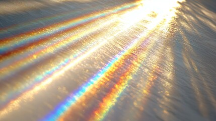 Close-up of glowing prism refracting sunlight into vibrant color bands on minimalist white surface, symbolizing wireless frequency allocation and spectrum analysis.