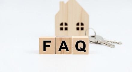 Wooden blocks spelling faq with a house and keys representing real estate frequently asked questions and property information